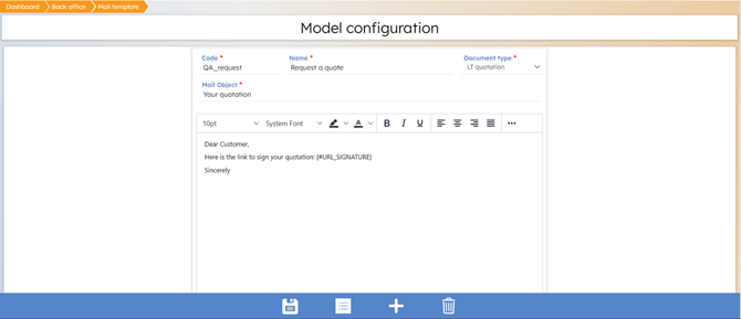 If you wish to modify the "LT quotations" e-mail template for signature requests, click on the magnifying glass as shown in the screenshot above.
