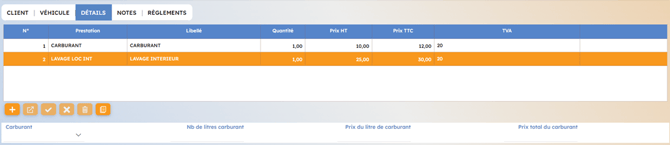 Sous la grille des prestations se trouve les champs liés à la facturation du carburant. Si ces champs sont renseignés, le total sera mis à jour et une ligne de facturation de carburant apparaîtra sur le bon lors de l’impression.