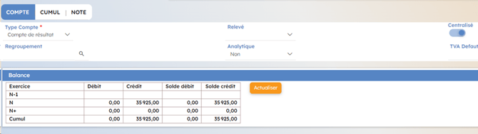 La balance du compte (sur l’exercice en cours et les exercices suivants et précédents) s’affiche en dessous, en cliquant sur le bouton « Actualiser ».