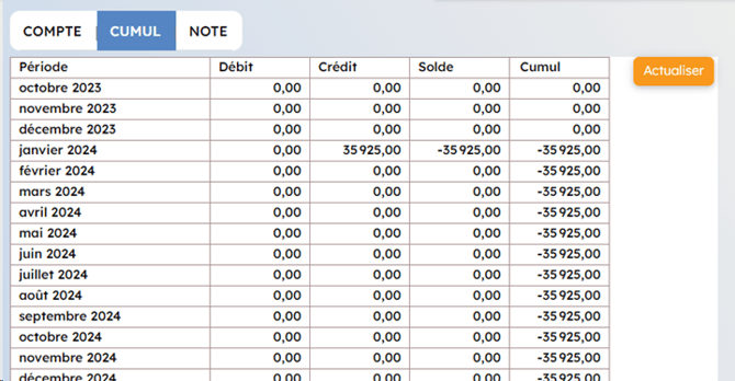 En cliquant sur le bouton « Actualiser », on visualise dans cet onglet le cumul de ce compte mois par mois, sur l’exercice en cours et l’exercice suivant.