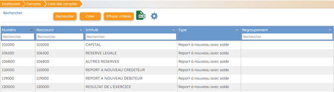 Le bouton d'export vert XLS télécharge la liste des comptes en format Excel |