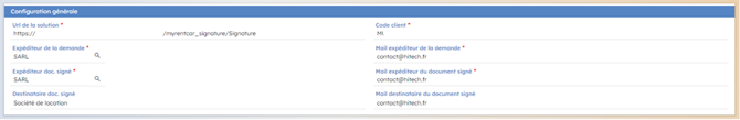 | Mail expéditeur du document signé | Ce champ sera automatiquement renseigné avec l'adresse e- mail du compte utilisateur expéditeur. Ce champ est obligatoire. S’il est vide, il faudra compléter l’adresse mail depuis le menu « Utilisateurs ». |