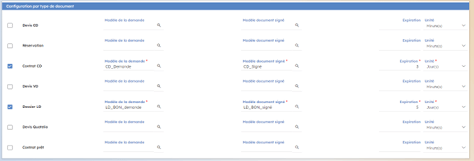 Pour activer la signature sur un ou plusieurs de ces documents, il conviendra de renseigner la configuration suivante par type de document :