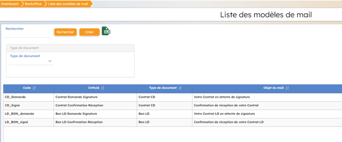 La liste affiche l’ensemble des modèles de mails utilisés pour la signature ou pour les envois de mails automatiques.
