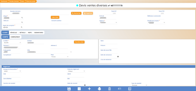 Les informations à saisir sur les devis de Ventes Diverses sont les mêmes que pour le bon (voir documentation correspondante) seul l’onglet « Règlement » est absent du devis.