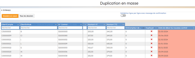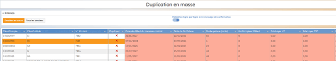 Pour chaque ligne de contrat à traiter, il s’agira de cocher la case « Dupliquer » et de vérifier/modifier les éléments du nouveau contrat qui va être crée.