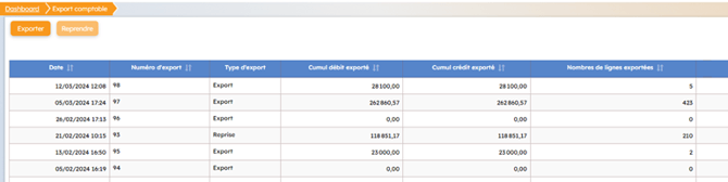 Le bouton "Reprendre" récupère des écritures déjà exportées, afin éventuellement de les réimporter dans votre logiciel. Sélectionnez au préalable la ligne d’export souhaité puis cliquez sur Reprendre. Le téléchargement des fichiers s’effectue alors comme pour l’export |