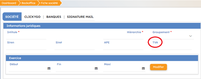 Le Siren, Siret et n° de TVA intracommunautaire doivent être renseigné dans la fiche de votre société. Pour cela, rendez-vous dans Backoffice à Sociétés à Fiche Société.
