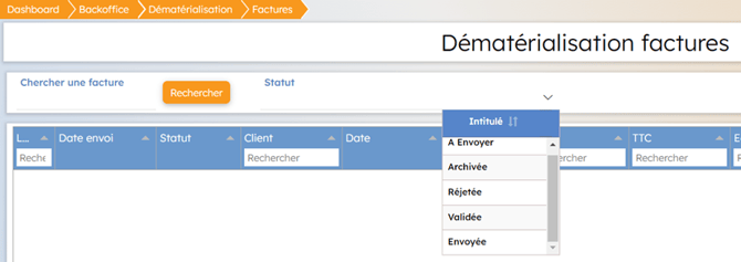 La recherche est possible dans ce menu par le numéro, le client, le montant ou encore le statut.