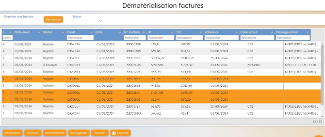 - Retransmettre : pour renvoyer une ou des factures rejetées après correction de l’erreur. Le code et le message d’erreur sont visibles dans le tableau
