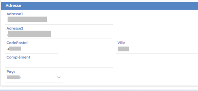Cadre "Adresse" : Saisir ici les coordonnées postales exactes du fournisseur soit : une adresse sur 1 ou 2 lignes, un code postal, une ville, un complément d’adresse et un pays.
