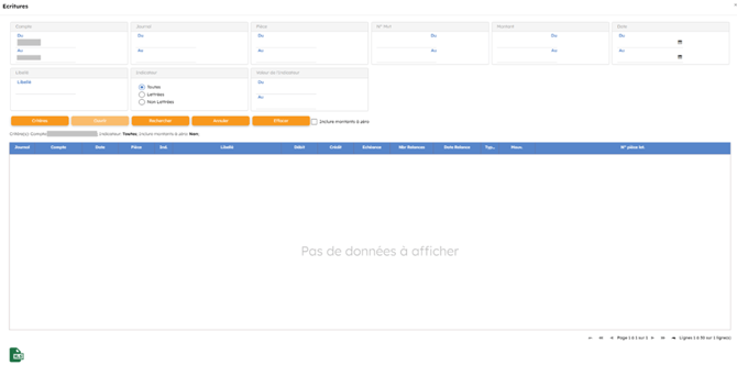 Cette fenêtre donne accès aux écritures comptables liées au fournisseur. Il est possible de cibler la recherche avec différents critères (date, numéro de pièce, libellé, …) et de consulter le détail de la ligne en cliquant sur l’écriture voulue.