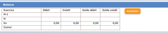 Cadre "Balance" : En cliquant sur le bouton "Actualiser" , une balance s'affiche pour ce fournisseur. L’exemple ci-dessus montre qu’il est possible d’avoir les données sur l’exercice actuel (N), précédent (N-1) et prochain (N+) en fonction de la clôture de ces exercices.