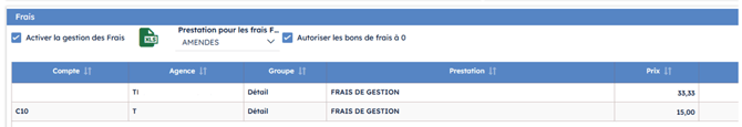 Des paramètres doivent ensuite être fournis pour la création d’un bon de frais : une agence par défaut, un groupe de facturation, la prestation à utiliser ainsi que le prix en HT.