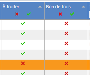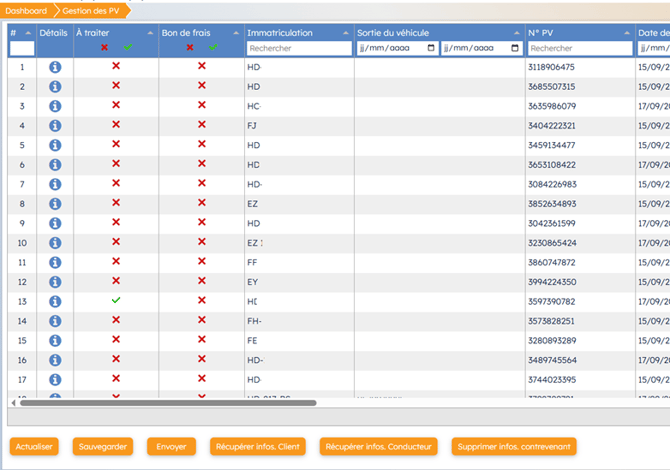 Les boutons de sélection en haut de la colonne « A traiter » et « Bon de frais » permettent de cocher ou non les infractions à traiter ou les bons de frais à générer, en cliquant au préalable sur la ligne sur laquelle on souhaite agir.
