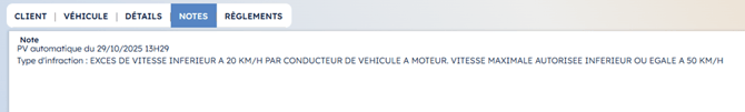 - Les notes indiquant la date/heure du PV ainsi que le type d’infraction