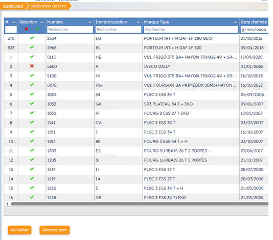Les boutons de sélection en haut de la colonne « Sélection » permettent de cocher ou non les véhicules à déclarer, en cliquant sur la ligne sur laquelle on souhaite agir. Si des véhicules ont été exclus, ils sont déjà désélectionnés.