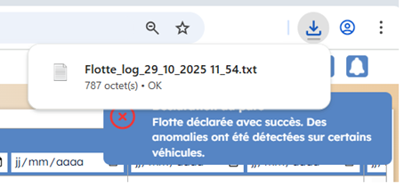 Une fenêtre de confirmation apparait en haut à droite. Dans le cas où des erreurs ont été constatées lors de la déclaration, un fichier de log est automatiquement téléchargé :