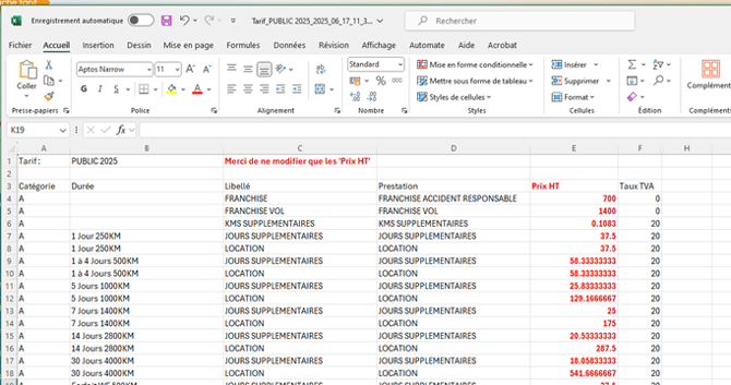 Cette grille exportée correspond par exemple au tarif PUBLIC 2025. Il conviendra de modifier si nécessaire uniquement la colonne E qui contient les prix en HT, puis de la réimporter.