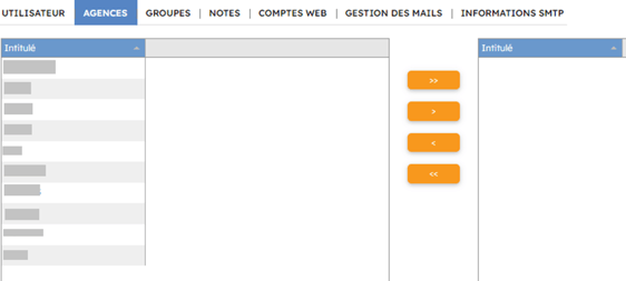 Dans l’onglet « AGENCES », faites glisser une ou plusieurs agences sur la droite pour l’affecter à l’utilisateur.