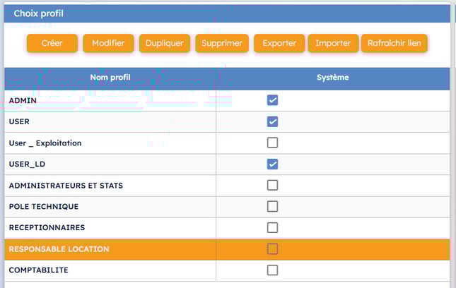 Le bouton "Créer" permet de créer un nouveau profil vide et de le configurer entièrement. Cependant cette manipulation n'est pas la plus aisée, il est plutôt conseillé de repartir des profils déjà mis à disposition. A noter que les profils cochés "Système" sont des profils par défaut qui sont réinitialisés par nos mis à jour (les modifications manuelles sont donc sans effet).