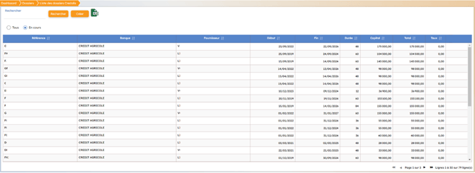 Le champ « Rechercher » permet une recherche de dossier par Référence, banque ou fournisseur.