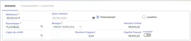 L’interface est la même que pour la création d’un dossier de financement. Cependant, dans le 1er onglet « Dossier », vous devrez remplir la partie en bas à droite notée « Location ».