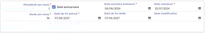 Renseignez également la date de 1ère échéance, la date de la signature. La date de fin prévue se renseigne seule en fonction de la durée.