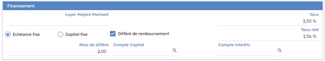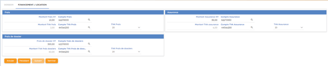 - Frais : frais inclus à chaque mensualité. Ajouter également le compte comptable lié aux frais, ainsi que le taux et compte de TVA
