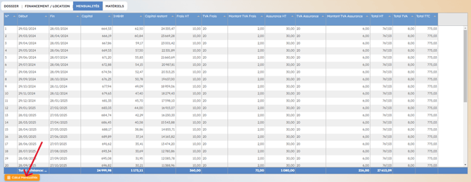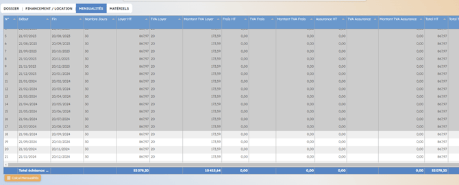 L’interface affiche maintenant les onglets « Mensualités » et « matériels » dont les fonctionnalités sont identiques à celles d’un dossier de financement.