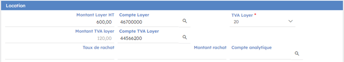 Complétez le montant du loyer Hors Taxes, le compte comptable et le taux de TVA. Le montant de TVA du loyer se calculera automatiquement, le compte comptable de TVA se renseigne également (il reste modifiable).