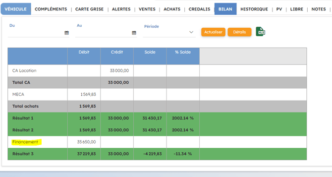 Vous retrouverez également le montant du financement dans l’onglet « Bilan » du véhicule.