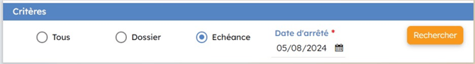 En premier lieu, sélectionnez vos critères : Comptabilisation de dossiers, des échéances ou des 2 (Tous). La date d’arrêté est obligatoire et est égale à la date du jour par défaut, mais elle est modifiable. Elle permet de borner les échéances à comptabiliser, jusqu’à la fin du mois par exemple.