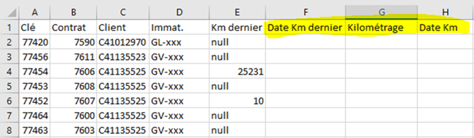 - Respecter l’ordre des colonnes suivant : Immat / Km / Date