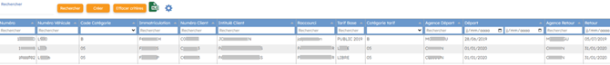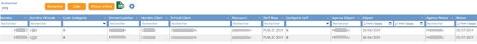 Comme ailleurs dans myrentcar, il est possible de modifier l’affichage de la liste en triant le tableau sur une colonne. Pour cela, une fois la colonne choisie, cliquez sur l’entête de celle-ci pour un tri ascendant et cliquez une nouvelle fois sur cette entête pour un tri descendant. Une flèche permettra de voir le tri appliqué.