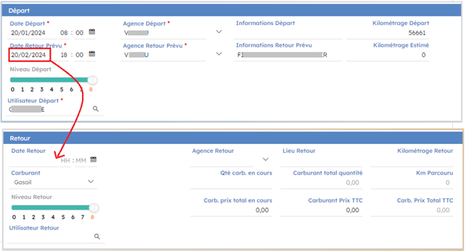 "Date Retour Prévue" : Saisir la date de retour prévue ou utiliser le calendrier pour sélectionner une date de retour prévue. Préciser l’heure si besoin.