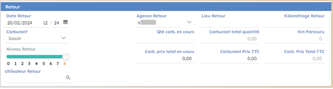 Le second cadre reprend toutes les informations saisies lors du retour réel du véhicule. Si le départ et le retour sont faits avec rentpad ou myrentpad, les informations de cet onglet seront automatiquement renseignées.
