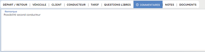 Cet onglet permet de saisir un commentaire à faire apparaître sur le contrat. Lors de l’impression du document, un cadre « Remarques » sera ajouté pour faire apparaître les commentaires saisis dans le champ de texte libre.
