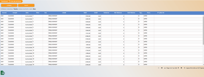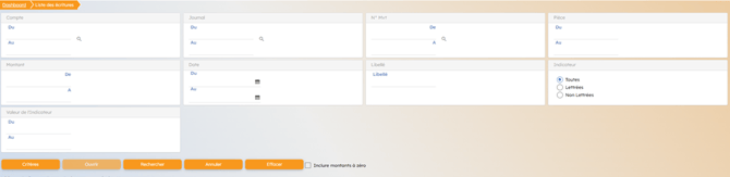 La recherche est alors possible sur le compte comptable, le code journal, le numéro de mouvement ou de pièce, le montant, les dates, le libellé ou encore l’indicateur de lettrage.