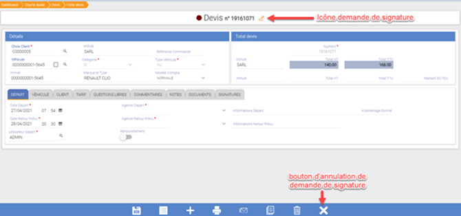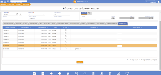 est affichée sur le document myrentcar et les boutons de signature sont remplacés par un bouton d’annulation de demande de signatures :
