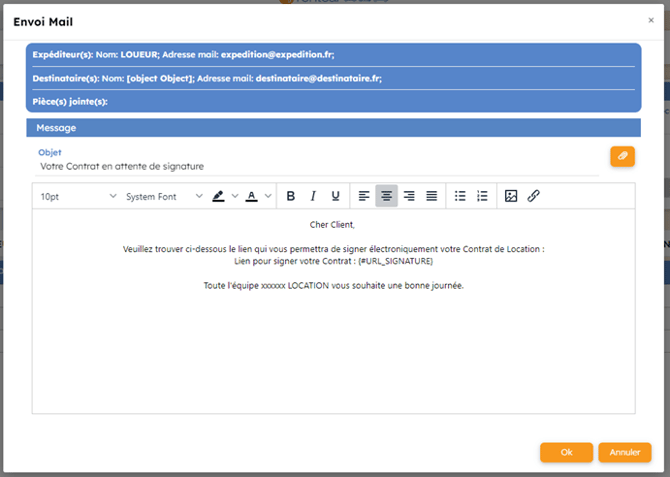 Le mail peut également être adressé en copie au loueur, si configuré dans le Backoffice.