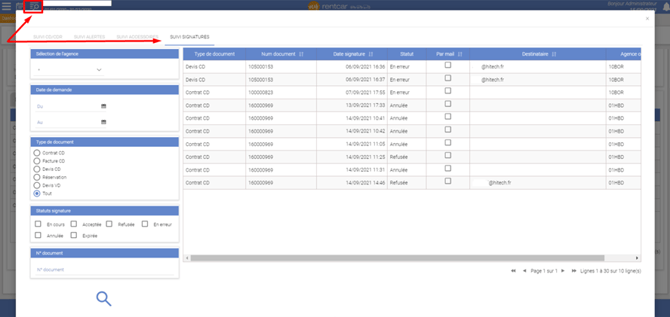 Au niveau du suivi CD/CDR, l’onglet « Suivi Signatures » vous permet de rechercher l'historique des demandes de signatures avec des filtres (signatures en cours, refusée, annulée, …)