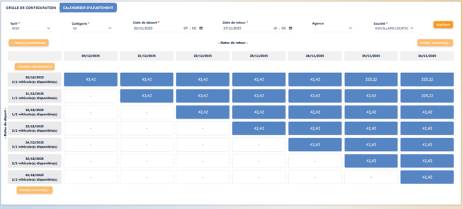 Depuis une configuration, il est possible de sélectionner une ou plusieurs catégories de véhicules, de définir une période selon les dates de départ ou les dates de prise en compte, puis d'appliquer un taux d’ajustement, positif ou négatif.