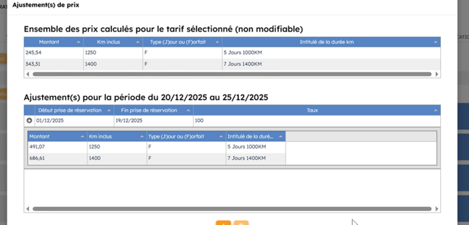 Ces ajustements actualisent instantanément les tarifs dans les grilles myrentcar et sur les périodes spécifiées.