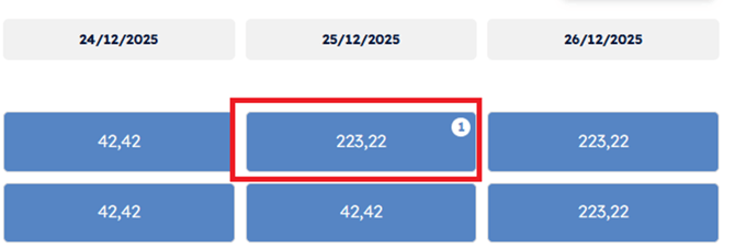 Dans cet exemple, pour une date de prise de réservation comprise entre le 01/12/2025 et le 19/12/2025, pour des départs de location compris entre le 20 et le 25/12/2025, le taux d’ajustement du tarif sera de 100% (tarif doublé).